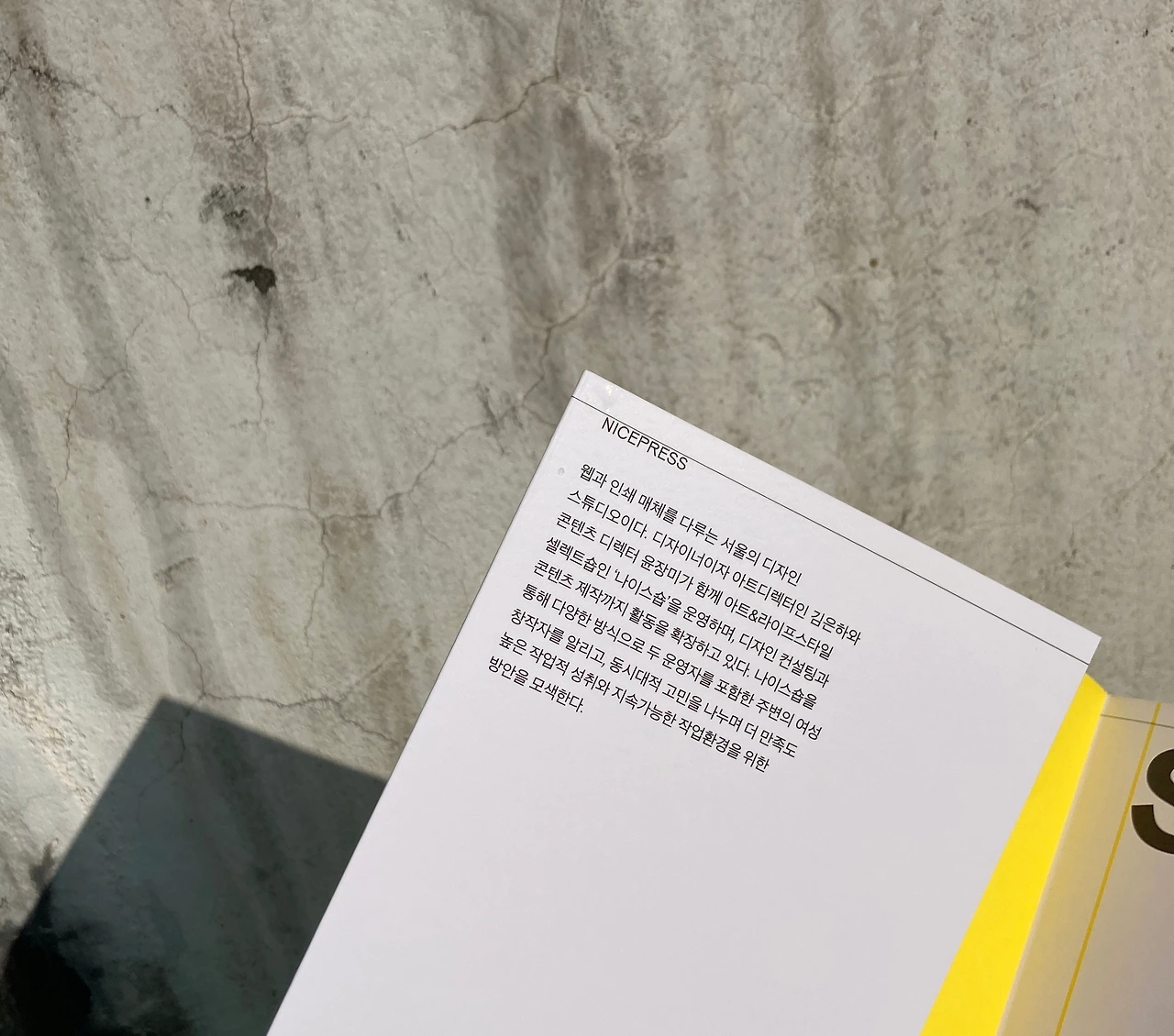 디자이너이자 아트디렉터인 김은하 님과 콘텐츠 디렉터인 윤장미 님이 아트&라이프스타일 셀렉트숍인 '나이스숍'과 함께 운영하는 스튜디오입니다. 여성 창작자의 이야기를 소개하는 책을 만든 분들도 멋진 여성 창작자이시기에 시작부터 완벽하다는 생각이 듭니다.