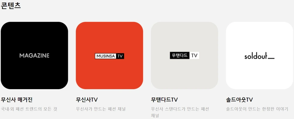 동시에 무신사는 패션에 대한 모든 정보와 커뮤니케이션이 이뤄지는 공간으로 온·오프라인 '무신사 매거진'과 유튜브 채널 '무신사TV'를 통해 패션을 경험하고 즐길 수 있는콘텐츠를 제공한다.