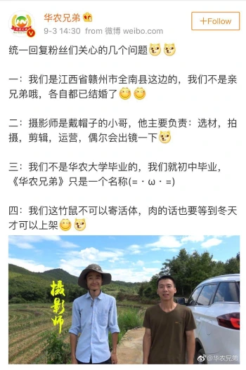 채널 이름은 화농형제(华农兄弟)로 쥐 농장을 하는 사람인데, 친구와 함께 영상을 시작했다고 한다.