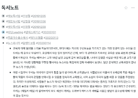 워크플로위는 마크다운 형식이 아니라 모든 문장의 시작에 점이 들어간다는 단점이 있다. 그래서 데이원보다 더 번잡하게 보인다. 그래도 태그 형식으로 정리해놓으니 편리하다. 또한 무슨 책을 얼마간 봤는지 바로 추적이 가능하고, 내용을 깔끔하게 확인할 수 있어서 앞으로는 주로 워크플로위를 이용할 듯하다.(+또 더욱 많은 내용 메모가 가능하다.)