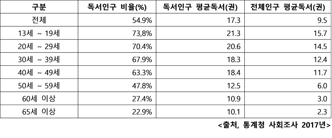 통계청 국가통계 포털에 따르면 2017년 우리 국민의 54.9%는 책을 읽고 있으며, 이들은 연평균 17.3권을 읽는다고 한다. 반면 절반에 가까운 전체 인구의 45.1%는 일 년에 한 권의 책도 읽지 않는 비 독서 인구이다. 일 년에 책을 한 권도 안 읽는 45.1% 국민 중 한 명이 나였다.
