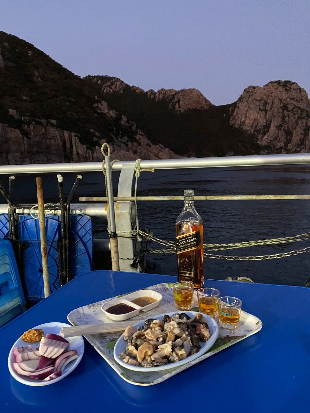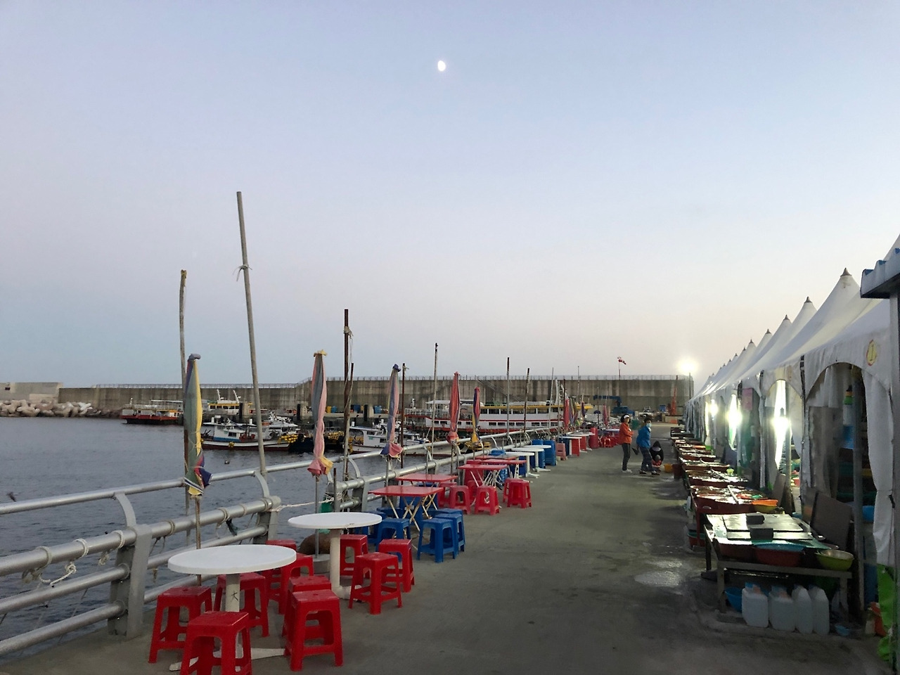 이제 홍도여행으로 돌아 가보자. 홍도는 정말 아름다운 곳이고 하루만 머물다 가기엔 많이 아쉬운 곳이다. 홍도에는 자동차가 없어 일단 섬이 아주 조용하고 도심의 소음에서 지친 우리에겐 그냥 그 고요함 속에 머무는 것 자체가 엄청난 힐링이다. 본인이 이곳 이장이 된다면 마을 소식을 그냥 복식호흡과 함께 크게 소리치면 섬 전체에 알리는 게 가능할 것 같은 정도다. 저녁 무렵 도착한 우리의 첫 일정은 해녀촌. 사실 방파제에 위치한 이 해녀촌 사진이 홍도를 선택하게 한 가장 큰 이유 중에 하나 인 것 같다. 일단 이곳에 오면 도심에선 접하기 힘든 자연산 담치를 꼭 먹어야한다. 씨알이 아주 훌륭하고 그 맛은 더할 나위 없다. 전복, 소라, 고둥, 해삼, 담치, 문어, 홍합라면까지 거기 있는 메뉴는 다 먹고 왔는데 탁 트인 야외테이블에 홍도의 밤풍경을 만끽하며 먹는 이 조합은 허벌나게 끝내준다. 가격은 해산물 모듬 3만원, 담치 2만원, 문어 2만원이었던걸로 기억한다. 술은 마트에서 고른 조니워커 블랙라벨로 콜키지를 했는데 흔쾌히 허락하셨다. 위스키와 바다 향을 가득품은 해산물과의 조합은 황홀하다.(물론 여기 초장이 끼어들면 안됨) 홍도에서는 야밤에 딱히 할 것이 없다. 아, 나이트클럽도 있긴했다. 일찍 자고 일찍 일어나서 일출을 이틀 연속 보는 내 인생에 매우 드문 경험을 한다.