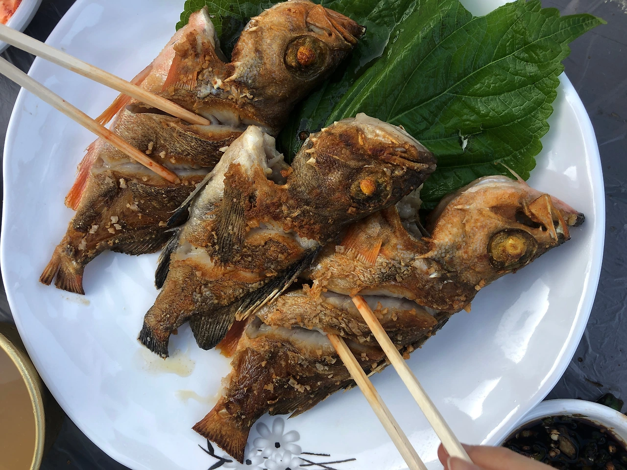 (등대펜션)직접 잡아오셨다는 열기&볼락 구이. 너무 맛있어서 우측사진과 같이 완전히 해체해버렸다. +보말라면, 파전 그리고 홍도에서 담근다는 보리막걸리도 곁들였는데 걸죽하니 시골막걸리 느낌인데 맛있었다.