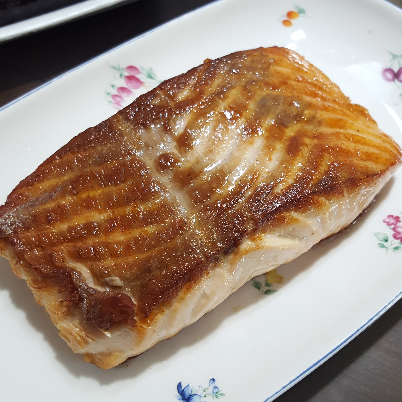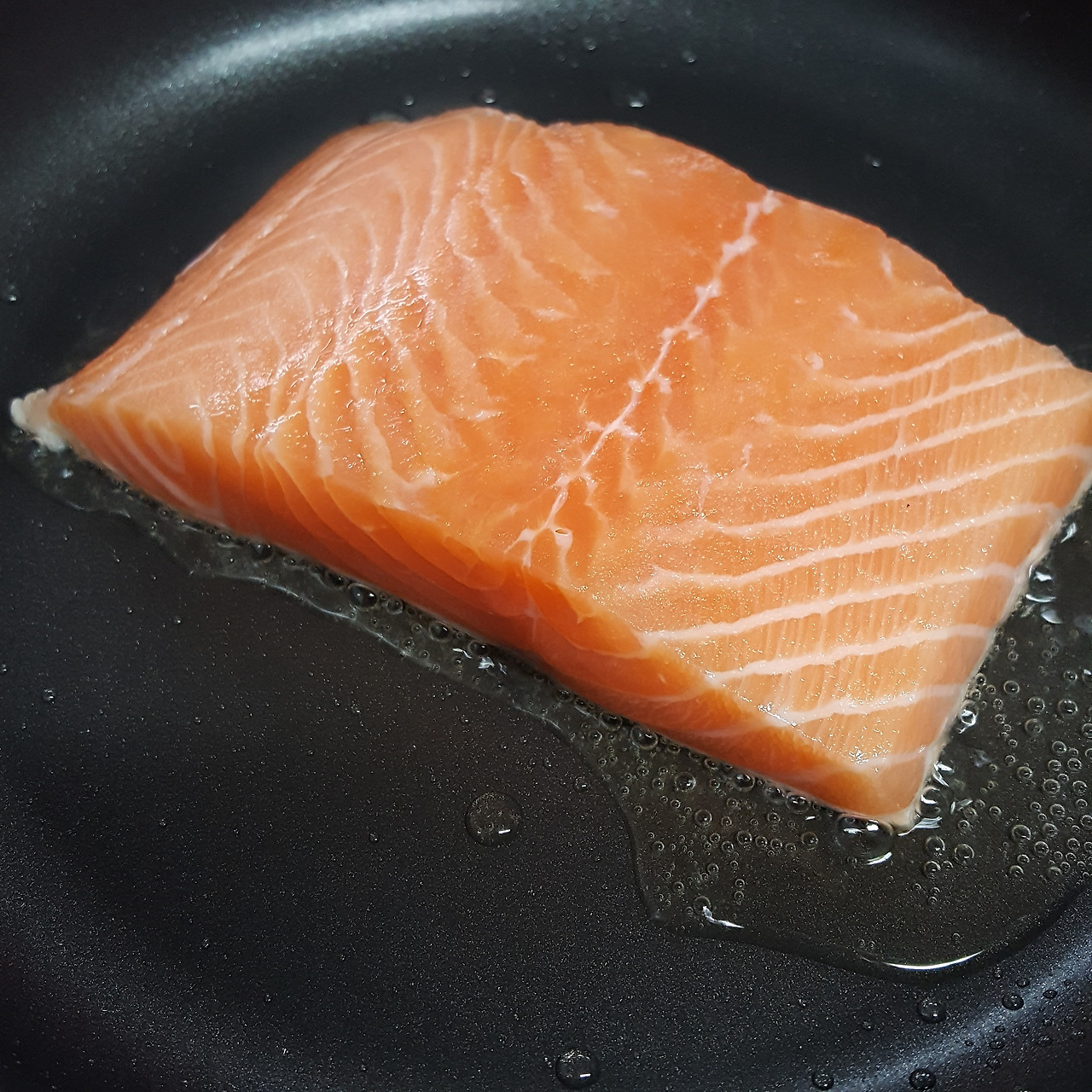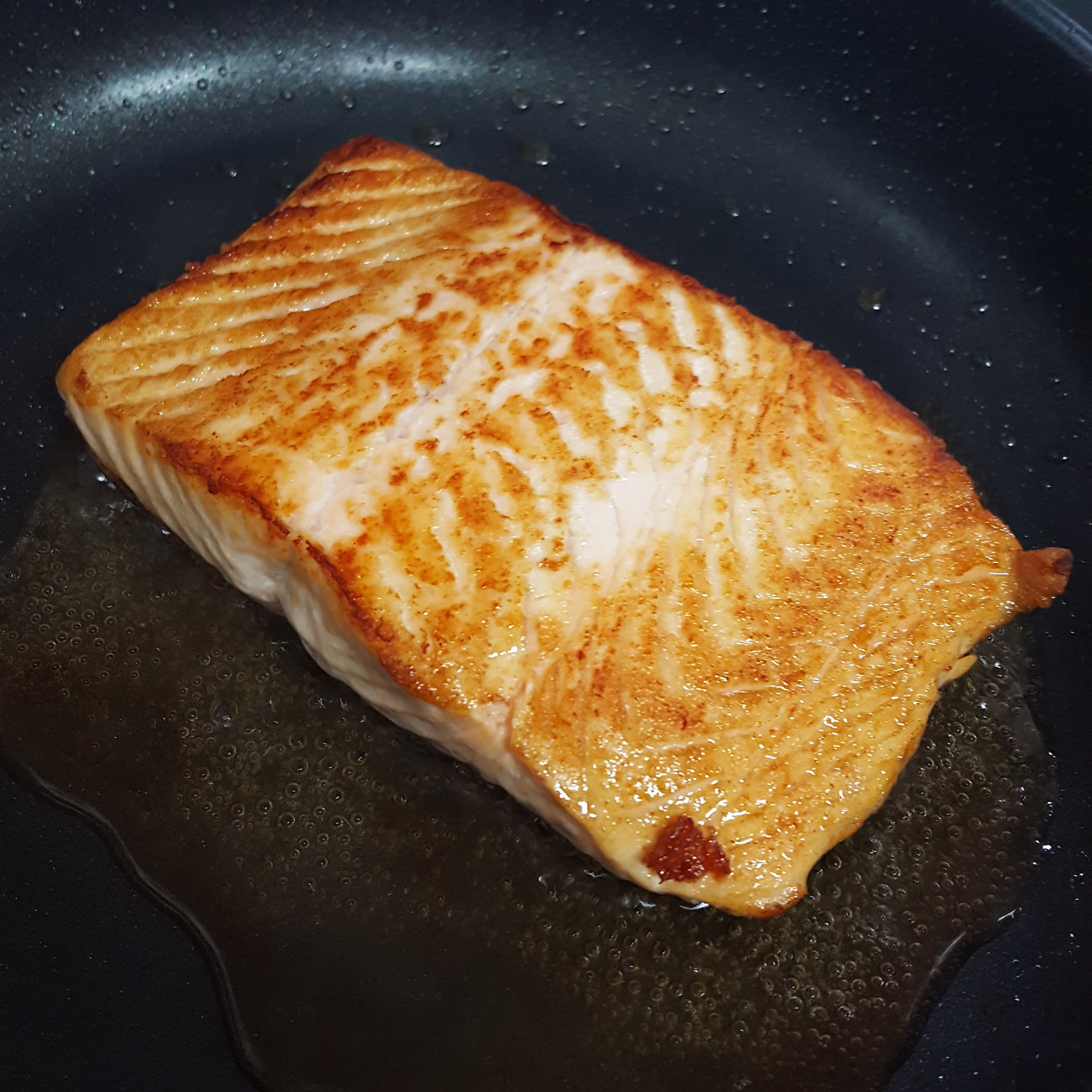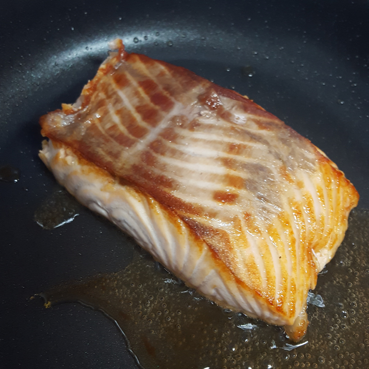 이제 팬에 있는 기름을 숟가락으로 떠서 연어 위에 뿌려주면서 1분 기다렸다가