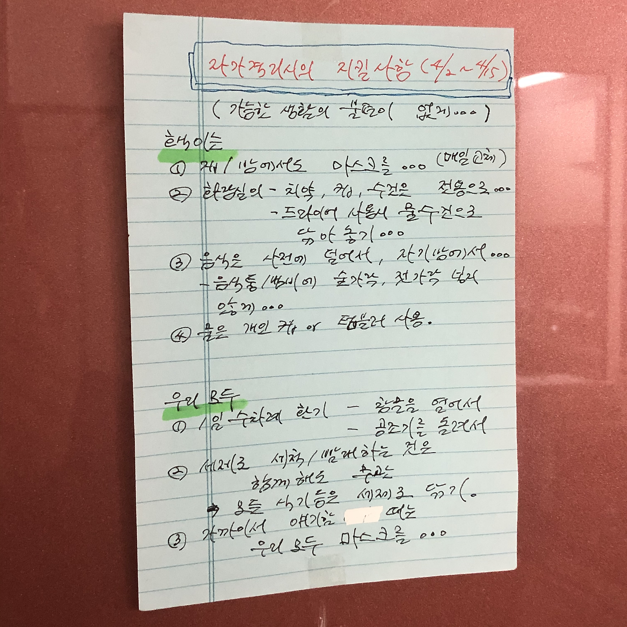 오빠는 미국에서 이미 열흘 격리를 하다 왔지만 그사이 공항을 통과해야 했기에 한국에 온 이후 지금까지 방에만 있다. 코 아래와 턱에 수염까지 기르면서. 그를 픽업했던 엄마도 덩달아 일주일 이상 집에만 계셨다. 공항에서 엄마는 오래간만에 만난 아들에게 멀찍이 떨어져서 손을 흔드는 것으로 포옹을 대신했다.