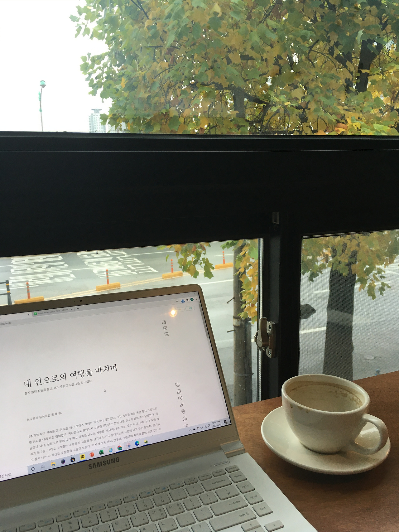 오랜만에 내리는 보슬비에 붉게 짙어진 잎들이 바닥에 떨어진 걸 보니 다시 한번 계절이 바뀌려나보다. 나는 아직도 내가 태어나고 자란 이 곳에서 홀로 적응 중이지만 이상하게 외롭지가 않다. 그것은 비로소 나 자신, 그리고 글과 함께 나의 삶을 즐겁게 만들어간다는 반증이리라. 여전히 꿈속에서 런던을 가고, 그곳에서 나는 '아 너무 그리웠어!'라고 종종 말한다. 하지만 그 꿈을 꾸고 잠에서 깨어나도 마음이 요동하지 않는다. 오히려 기운을 더 내본다. 지금은 그곳에서 배운 것들을 써먹을 때니까. 무엇보다도 나의 지금이 소중하니까.