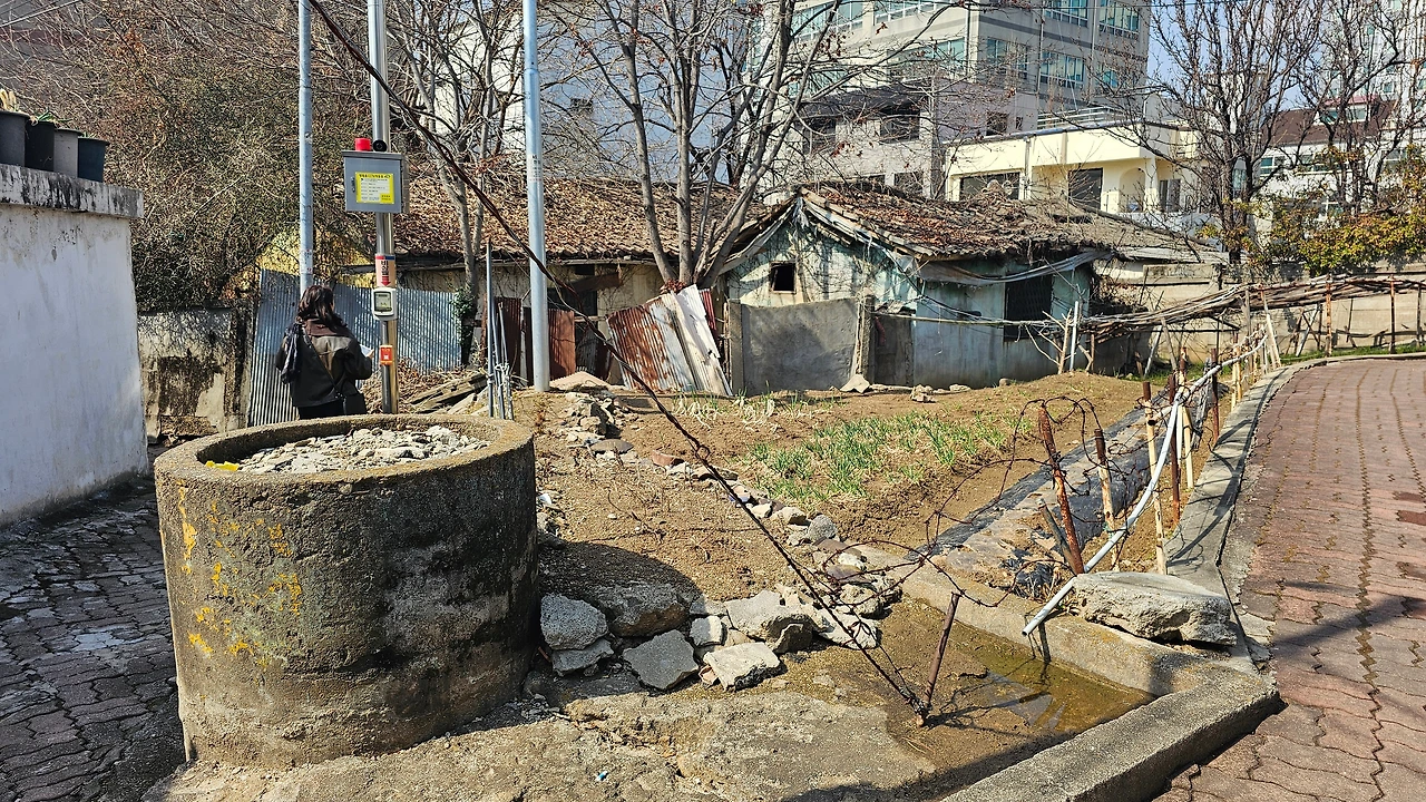 그 집을 자세히 보러 목련나무 옆 골목으로 들어갔다. 갑자기 공터가 열린다. 웰컴 투 동막골이다. 가운데 우물이 있다. 우물의 모습은 남았으되 물대신 잡동사니로 그득 차 있다. (나중에 찾아보니 더이상 물을 긷지 않는 우물은 사람이 빠질까봐 이런 식으로 메운다 한다. 또 우물자리를 함부로 없애면 좋지 않다는 믿음도 있다고 한다.) 우물 주변으론 텃밭이 좀 있고 시간의 층위를 달리하는 다양한 집들이 둘러싸고 있다. 공동우물이 있던 시절에 양지바른 동네가 북적거리던 모습을 저절로 상상하게 된다.