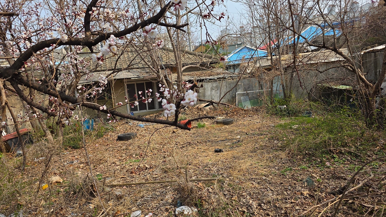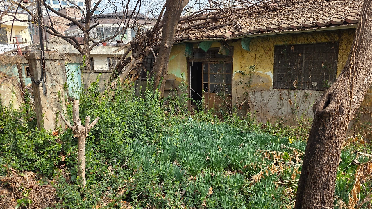 이번에 보니 바로 옆집 몇 채가 헐려 주차장이 되어 있다. 주차장을 만들며 무릎 높이만큼 땅을 돋우는 바람에 오동나무집은 대문이 막혀버렸다. 집이 빈 게 먼저인지 앞을 막은 게 먼저인지 알 순 없지만 이 기이한 광경이 낯설지 않다. 구도심을 걷다 보면 발치와 옆구리가 개발로 떨어져 나간 뒤 길 잃은 집으로 남은 경우가 종종 있다. 대문은 막고 쪽문을 낼 수밖에 없는 처지가 된 채 버티는 집들도.