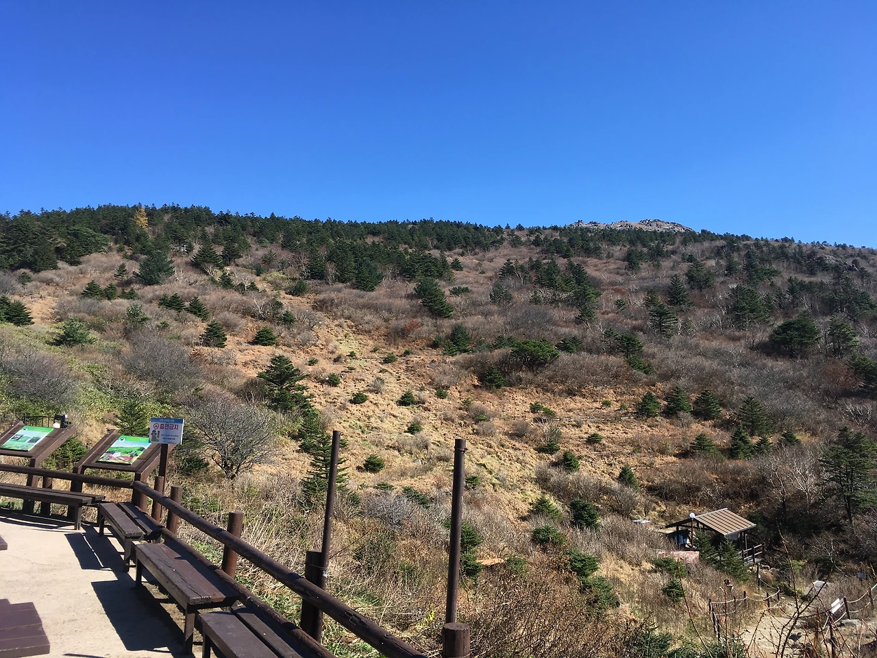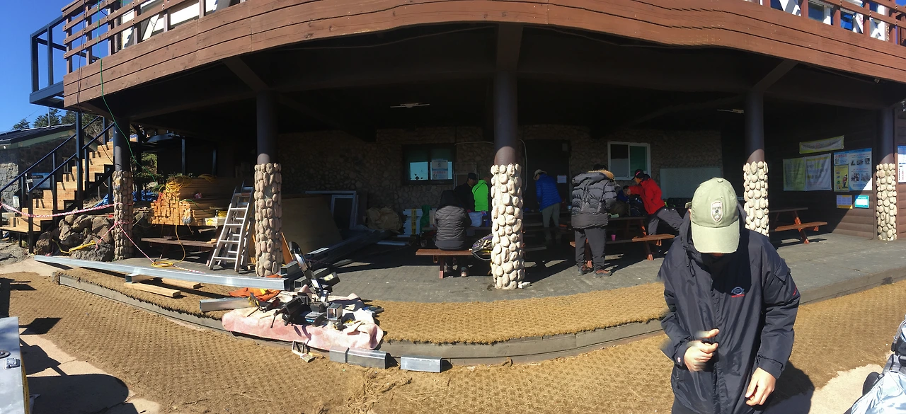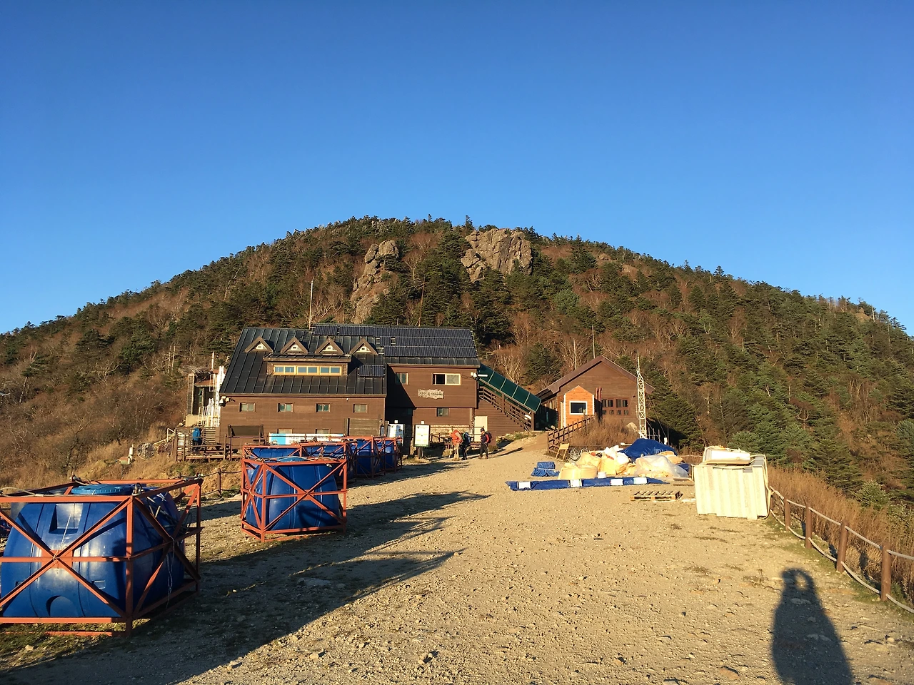 지는 해와 함께한 이튿날, 어느새 즐거운 산행이 끝났다. 천왕봉 아래 이색적인 건물이 발견된 것이다. 만 배 키운 휴지심같이 생긴 물건이 길의 좌우로 죽 늘어서 있었다. 만약 인류가 화성에 테라포밍을 위한 대피소를 만든다면 저와 같지 않을까 하고 생각되는. 그 너머에 마지막 대피소, 장터목 대피소가 있었다.