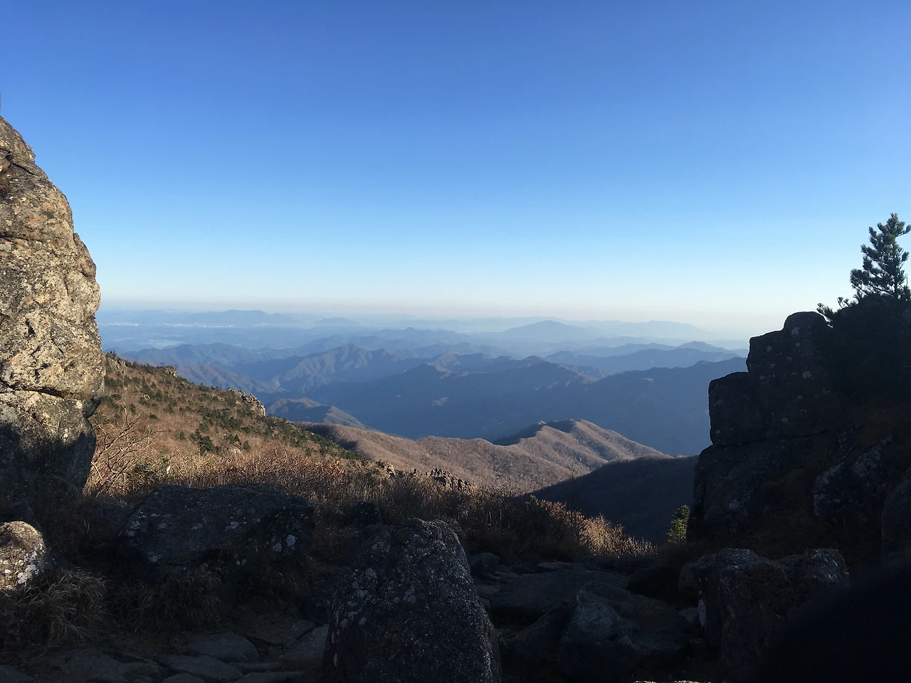 가을 하늘의 티 없이 맑음을 하늘과 가장 가까운 곳에서 걷는 기분, 경험해보지 못한 사람은 평생 모를 기쁨이다. 시야를 방해하는 높은 나무도, 곁에 높다랗게 서 있는 산도 없이 맑은 능선을 쭉 쭉 걸어 나갔다. 평야가 아름다웠던 세석평전을 지나고 슬슬 해가 기울어져 갔다. 능선을 건너 건너 정면에 커다란 산이 보였다. 나는 그것이 천왕봉인가 했었지만 아니었다. 그 커다란 산은 그림자도 거대했다. 해가 기울수록 그림자는 점점 커다랗게 부풀었다. 우리가 가는 길이 실시간으로 점점 더 시커멓게 변했다. 여태껏 이렇게 큰 그림자를 만난 적이 있었나. 이게 정말로 산 그림자구나 싶었다. 이런 건 복잡한 도시에서 절대 볼 수 없으리라. 그림자 산을 옆구리로 돌아 돌아 빠져 나가자 머털도사가 수련하던 누덕봉 같은 전경이 펼쳐졌다. 산과 산을 이어주는 길은 아주 얇았고 그 옆으로는 깊은 낭떠러지가 나 있었다. 좁던 길은 점점 더 넓어졌다. 그리고 그 끝에 홀로 길을 덮고 있는 커다란 봉우리가 보였다. 꼭 지상에서 보던 산 같았다. 산속의 산, 천왕봉. 웅장한 자태에 절로 고개가 숙여졌다.