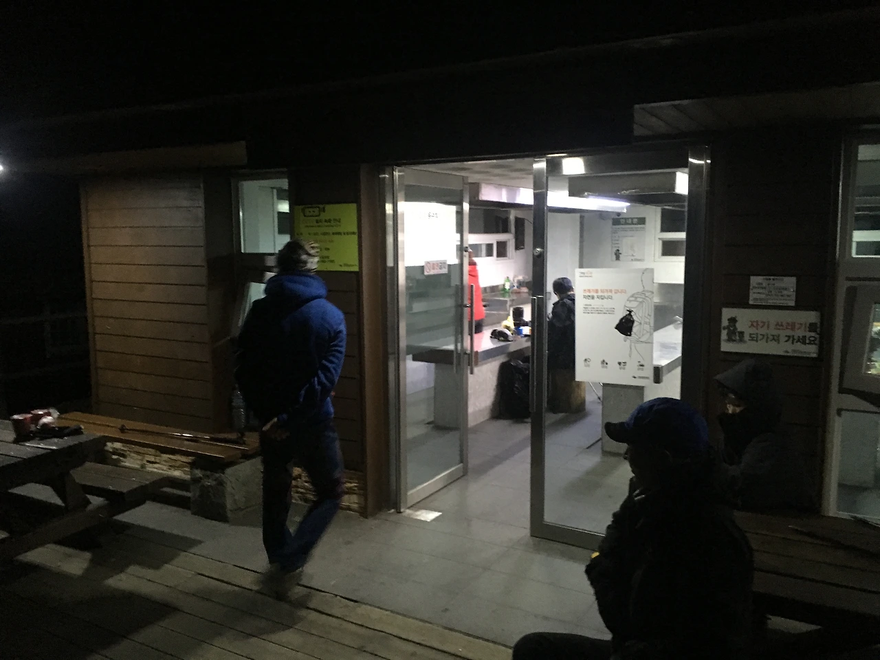 성삼재로부터 시작된 여정은 흘러내리기 시작하는 땀방울과 비례해서 점점 거칠어갔다. 데크 계단을 깔 필요가 없기 때문인지 돌 무더기로 얼기설기 쌓아올린 비좁은 층계를 올라야 했다. 이게 진짜 산행이구나 생각될 무렵 매끈하고 평탄한 시멘트 길을 밟게 되었다. 노고단 대피소의 첫 인상이었다. 파란색 슬레이트 지붕으로 얻어놓은 화장실, 지대가 확실히 보이지 않아 몇층인지 구분되지 않는 대피소 본 건물, 그 옆에 취사실이 있었다. 열명 남짓 되는 사람들이 옹기종기 모여 아침식사를 준비하고 있었다. 나는 오는 길에 두 번이나 쉬었지만 밝은 불 아래서 마음놓고 앉아있다 가고 싶었으므로 취사장 바깥 야외 테이블에 가방을 내려놓고 자리에 앉았다. 가방 옆구리에 꽂아 놓은 물병으로 한 모금 물을 들이키고 주변을 둘러보는데 성삼재 후반부부터 길을 같이 쓴 노부부가 말을 걸어왔다.