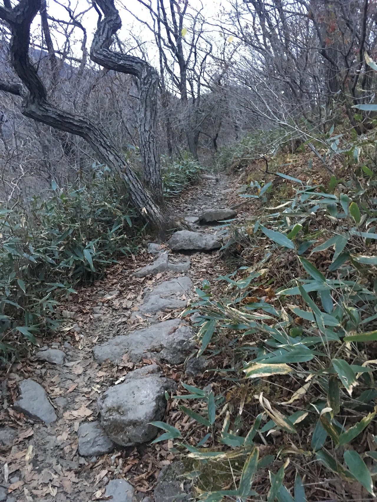 배낭을 다시 짊어지고 랜턴을 새로 셋팅했다. 이제부터는 경사 높은 내리막이기 때문에 잘 보고 가야했다. 약 10분 정도 삐뚤빼뚤한 돌 길을 밟고 내려와서 산 허리를 끼고 도는 좁은 평지길에 다다랐다. 대체로 평탄했지만 중간중간 큰 바위가 가로막고 있어서 지루할 틈 없이 다닐 수 있었다. 이제야 지리산 깊숙히 들어온 것인지 바짝 말라있던 지금까지의 길과 달리 산길 바닥이 군데군데 축축하게 젖어있었다. 하늘이 점점 밝아왔다.