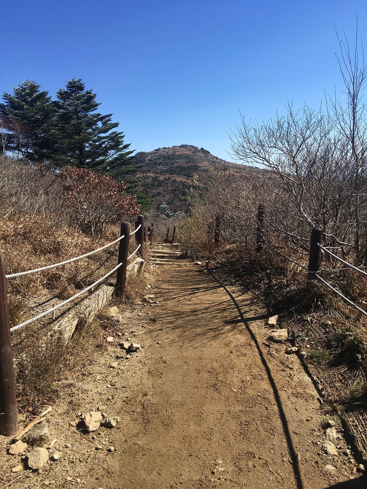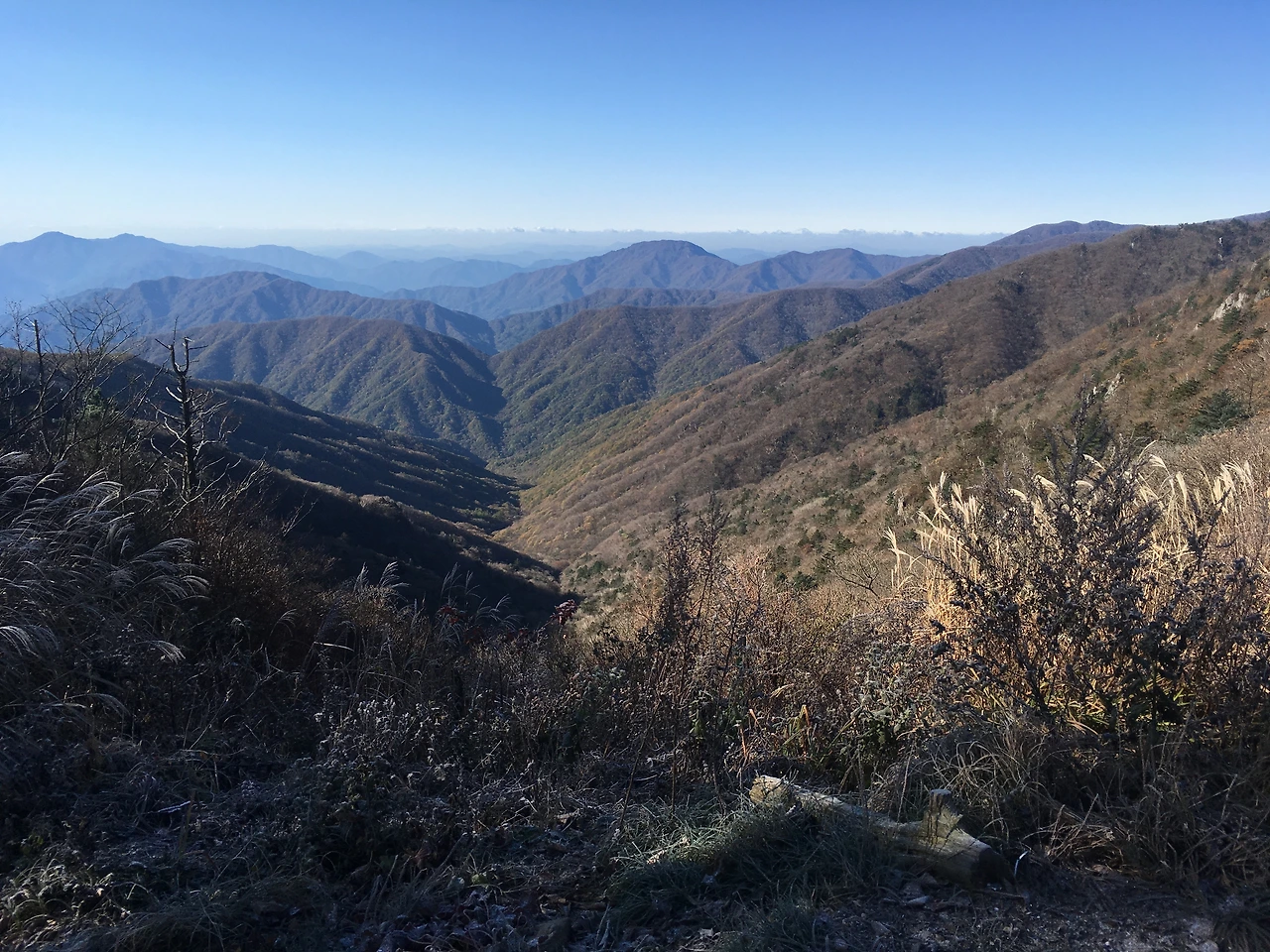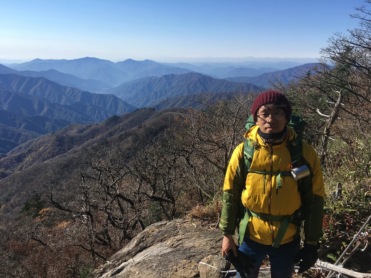 벽소령의 험준한 계곡을 가로지를 때와는 달리 고른 평지에 드문드문 바위가 솟아있는 정도로 편안한 길이 이어졌다. 바람이 거세게 불기는 했지만 풀들을 가로지르다 번번이 자신을 뽐내고 있는 지리산의 절경이 고통도, 미래도, 아무것도 신경 쓰지 못하게 만들었다. 가냘픈 안전바 너머에 겹겹이 산들이 둘러싸여 있었고, 산마다 작은 길이 나 있었다. 더 너머에는 바다가 보였다. 여기에 지리산이 있었다. 따뜻한 커피를 한 모금 마시고 사진을 찍었다.