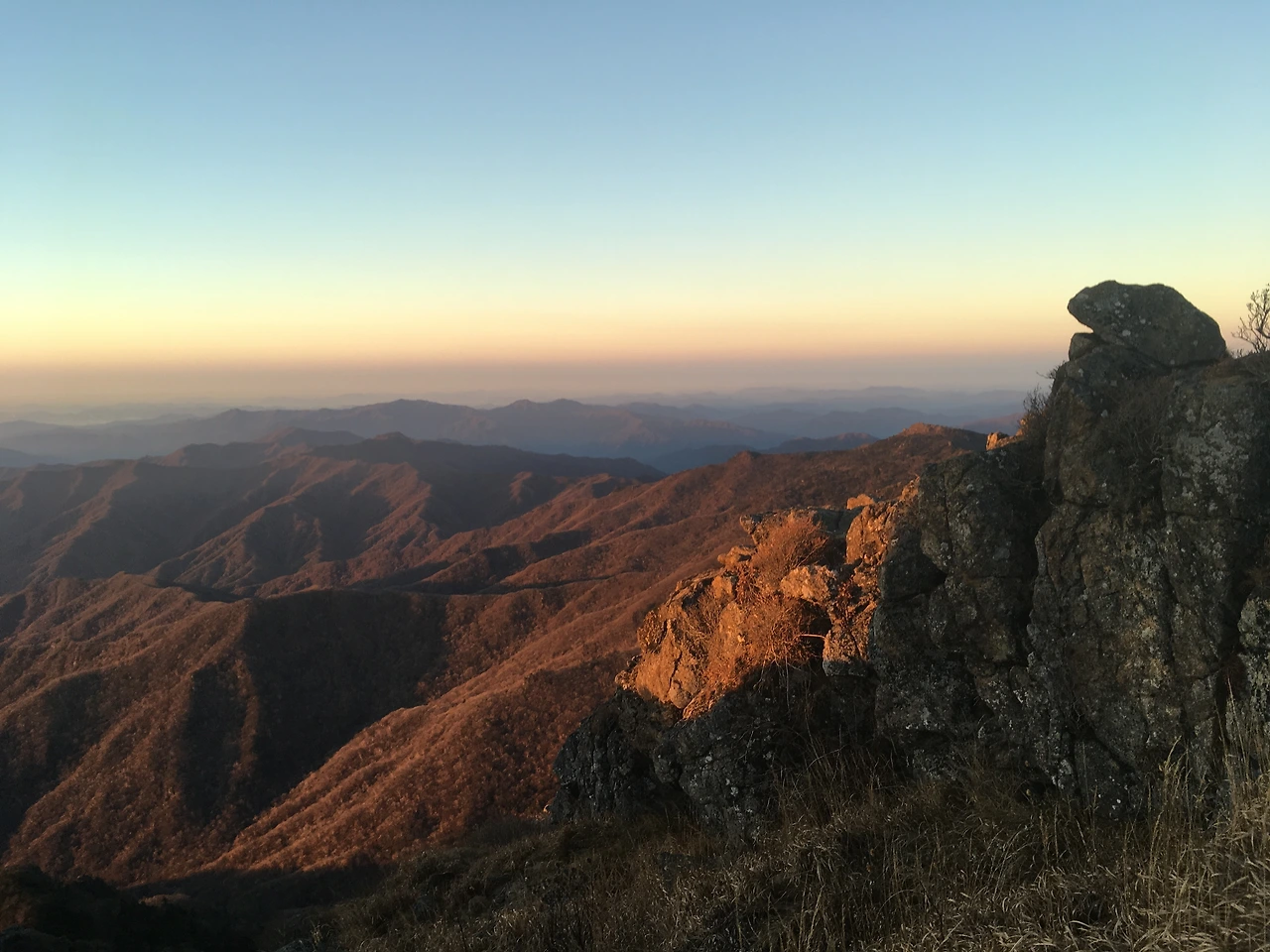 넓다고 할 수 없는 천왕봉 등허리에 사람들이 많이 올라 섰다. 제각기 가지고 있는 카메라를 들어 현장을 담아내는데 여념이 없었다. 앞서거니 뒷서거니 서로 사진을 찍어주고 따뜻한 차를 나누어 마셨다. 점점 해가 떠올랐다. 조악한 스마트폰 카메라로 실시간 촬영하고 있는 나. 이 감동이, 이 순간이 기록될 수 있을까? 당연히 불가능하겠지만 이 순간을 떠올리는 단초가 될 수는 있을터. 돌에 기대어 앉은 지 삽십 분, 마침내 세상이 환하게 밝아졌다. 인생의 길을 찾기 위해 시작한 산행. 내 인생을 찾았는지 어쨌는지는 알 수 없지만 적어도 확실한 것 한 가지 만큼은 분명했다. 산은 항상 거기에 있다. 다시 와야겠다, 생각했다.