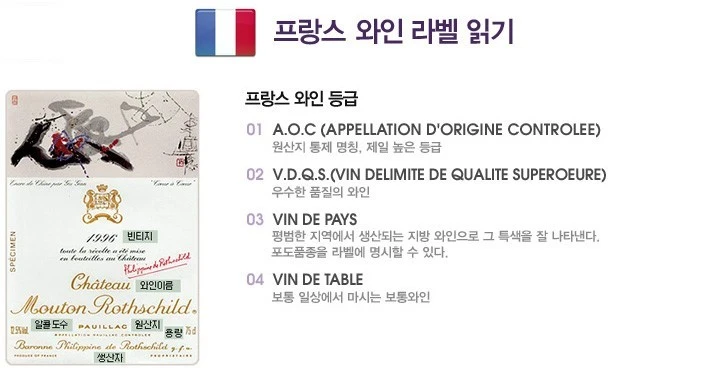 즉, 라벨에, ‘Appellation 생산지 Contrôlée’ 라고 적혀있으면 맛을 확인할 수는 없지만 품질은 어느 정도 보장된다는 뜻이다.