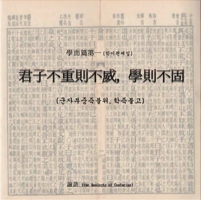 孔子께서 말씀하셨다. “君子가 厚重하지 않으면 위엄이 없고 배움도 견고하지 못하다. 忠信으로 주장하며, 자기만 못한 자를 벗 삼지 말고, 허물이 있으면 고치기를 꺼리지 말아야 한다.”