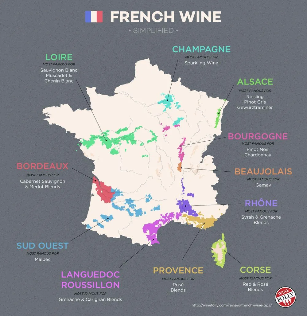 프랑스에서 와인을 생산하는 지역은 매우 많고 넓기 때문에, 인지도가 높은 보르도(Bordeaux), 부르고뉴(Bourgogne), 샹파뉴(Champagne), 알자스(Alsace), 보졸레(Beaujolais), 론(Rhône)등으로 나뉘는데 세부적으로 각 지역별 와인에 대해 알아보기로 하자.