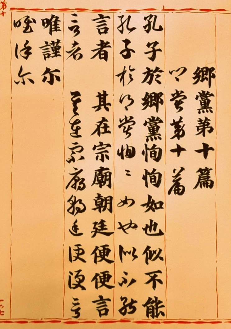 孔子께서 鄕黨(지방)에 계실 적에는 信實하게 하시어 말씀을 잘하지 못하는 것처럼 하셨다. 孔子께서 宗廟와 朝廷에 계실 적에는 말씀을 잘하시되 다만 삼가셨다.