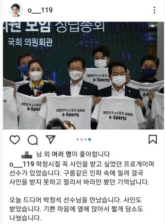 그런데 한 달 뒤, 이재명 대선후보가 국회의원회관에서 열린 ‘e스포츠 발전을 위한 국회의원 모임 창립총회’에 참석하여 산업 발전 방안을 논의하는 행사를 치르는데 오영환이 동석한 것이었다. 문제는 이후 그가 올린 한 장의 SNS 사진이었다.