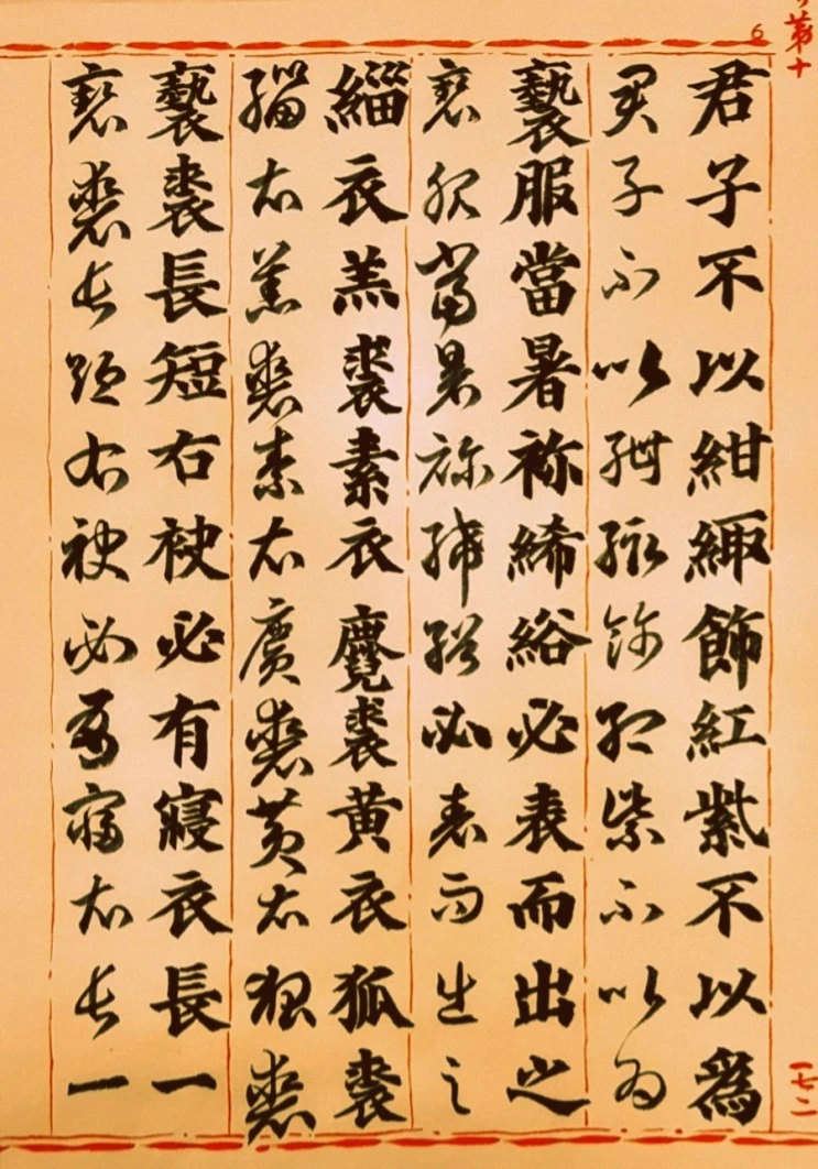 君子는 紺色과 붉은색으로 옷을 선두르지 않으시며, 홍색과 자주색으로는 평상복을 만들지 않으셨다. 더위를 당하시어 가는 葛布와 굵은 葛布로 만든 홑옷을 반드시 겉에 입으셨다. 검은 옷에는 검은 염소 가죽 갖옷을 입고, 흰옷에는 흰 사슴 새끼 가죽 갖옷을 입고, 누런 옷에는 누런 여우 가죽 갖옷을 입으셨다. 평상시에 입는 갖옷은 길게 하되, 오른쪽 소매를 짧게 하셨다. 반드시 잠옷이 있으셨으니, 길이가 한 길하고 또 반이었다. 여우와 담비의 두터운 (푹신한) 가죽옷으로 거처하셨다. 脫喪하시고는 〈佩物을〉 차지 않는 것이 없으셨다. 帷裳(주름치마)이 아니면 반드시 〈치마의 허리통에 주름을 잡지 않고〉 줄여서 꿰매셨다. 염소 가죽 갖옷과 검은 冠차림으로 弔問하지 않으셨다. 吉月(초하루)에는 반드시 朝服을 입고 조회하셨다.
