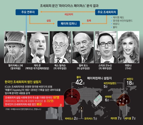 그러나 2017년 11월 여왕이 본인 사유 재산을 관리하는 랭커스터 공국을 통해서 일부 자산을 조세피난처에 투자했다는 사실이 <파라다이스 페이퍼스>의 폭로로 밝혀지자, 그녀가 이전에 쌓아왔던 국민들에게 인정받는 대인배라는 이미지에 심각한 타격이 가고 말았다. 랭커스터 공국은 두 피난처 모두 영국의 해외 영토며 투자 자체는 불법이 아니라고 해명했지만 이미 영국 국민들은 왕실에 대한 신뢰를 모두 박살내버린 후였다.