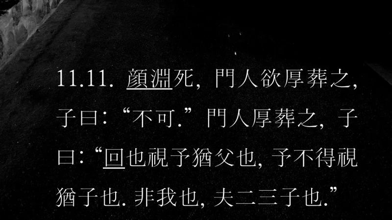 顔淵이 죽자 門人들이 후히 장사 지내려 하니, 孔子께서 “옳지 않다.” 하셨다. 門人들이 후장하자, 孔子께서 말씀하셨다. “顔回는 나 보기를 아버지처럼 여겼는데, 나는 〈그를〉 자식처럼 보지 못했으니, 내가 그렇게 한 것이 아니라 저들이 한 것이다.”