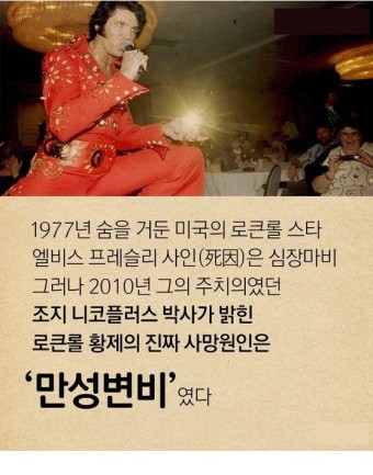 결국 엘비스 프레슬리는 변비로 인한 대변 중독으로 인해 그로 인한 여러 가지 합병증을 앓아왔고 결국 그로 인한 심장마비로 사망한 것이 아주 오랜 후에 밝혀졌다. 실제로 엘비스 프레슬리의 영구를 부검한 결과 대변이 대량으로 검출되었고 대장이 비정상적으로 비대해진 데다가 중독으로 인한 붓기 증상이 발견되었음이 기록에 남아 있다.