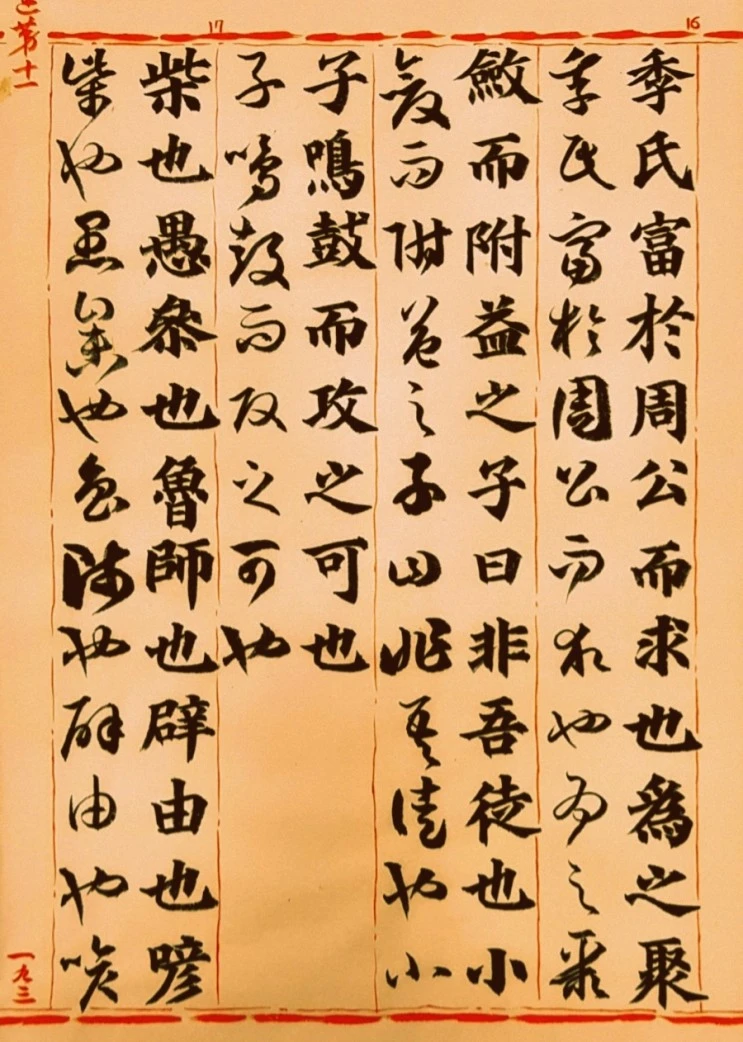 季氏가 周公보다 부유하였는데도 求(冉有)가 그를 위해 聚斂(세금을 많이 거둠)하여 재산을 더 늘려주었다. 孔子께서 말씀하셨다. “〈求는〉 우리 무리가 아니니, 小子들아! 북을 울려 죄를 聲討함이 옳다.”