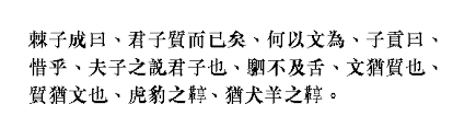 棘子成曰: “君子質而已矣, 何以文爲?” 子貢曰: “惜乎夫子之說君子也! 駟不及舌. 文猶質也, 質猶文也, 虎豹之鞹猶犬羊之鞹.”