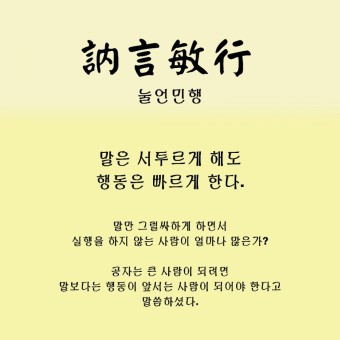 말이 실천과 뗄래야 뗄 수 없는 관계인 것은 언행(言行)이라 한 단어로 묶어서 말하는 것만 보더라도 알 수 있다. 그런데 재미있는 것은 공부를 통해서 내실을 갖춘 자는 이미 내실을 충분히 갖추었으니 말로 그것을 표현하고 끄집어내어도 부끄럽지 않을 것인데 그것을 삼가며 함부로 말을 꺼내놓지 않는다. 내실을 쌓은 자는 함부로 말을 내는 것이 얼마나 위험한 일인지에 대해서 충분히 알고 있기 때문이다.