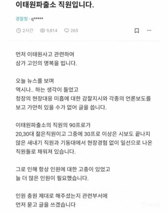 경찰청 본청에서 갑자기 손절하고 꼬리 자르기로 자신들의 목을 누군가 잘라버리기 전에 움직이겠다며 나선 압수수색 등에 발끈하여 이태원 파출소의 직원이 경찰청 게시판에 대놓고 ‘우리가 상위청에 기동 병력을 요청했는데, 서울청과 경찰청은 응하지 않아 놓고서 우리만 턴단 말인가?’라고 억울하다고 고개를 버쩍 쳐들어 보였다.