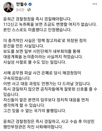 정인이 사건 때 졸지에 양천경찰서장에서 잘린 총경은 자신이 수사한 사건이라서, 자신이 금품 향응을 제공받았기에 책임을 졌던가? 용산경찰서장은 책임을 지고 자르는 건 당연하다면서 대통령이 무슨 책임을 왜 져야 하냐고 부르짖는 자가 과연 정상인지 나는 도저히 알지 못하겠다.