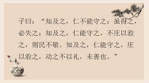 子曰: “知及之, 仁不能守之, 雖得之, 必失之. 知及之, 仁能守之, 不莊以涖之, 則民不敬. 知及之, 仁能守之, 莊以涖之, 動之不以禮, 未善也.”