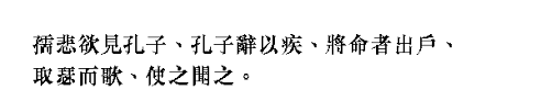 유비(孺悲)가 孔子를 뵙고자 하였는데, 孔子께서는 병이 있다고 사양하시고 명령을 전달하는 자가 문밖으로 나가자, 瑟을 가져다가 타면서 노래를 부르시어 그(孺悲)로 하여금 듣게 하셨다.