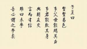 子夏가 말하였다. “어진 이를 어질게 여기되(존경하되) 女色을 좋아하는 마음과 바꿔서 하며, 父母를 섬기되 능히 그 힘을 다하며, 君主를 섬기되 능히 그 몸을 바치며, 朋友와 더불어 사귀되 말함에 성실함이 있으면, 비록 배우지 못했다고 말하더라도 나는 반드시 그를 배웠다고 이르겠다.”