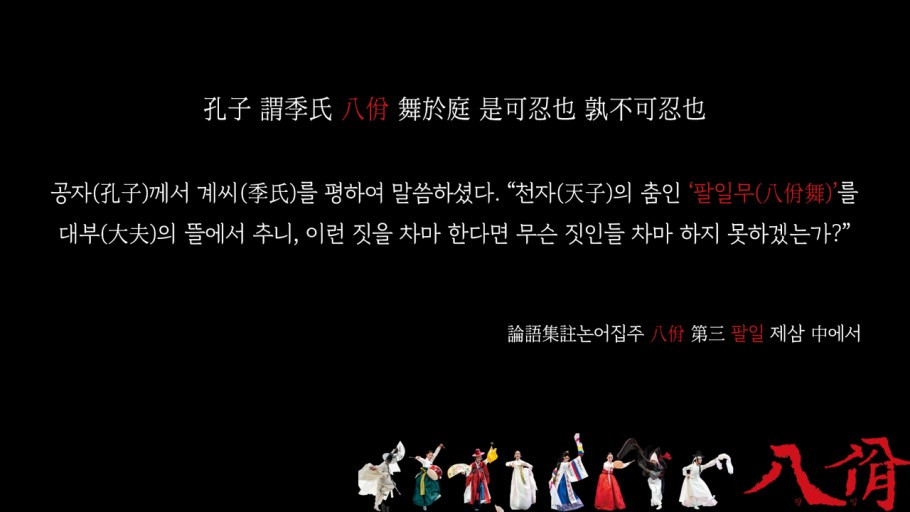 공자께서 계씨를 두고 말씀하셨다. "팔일무를 자신의 뜰에서 공연하게 하였으니 이런 짓을 차마 한다면, 무엇을 차마 하지 못하겠는가?"