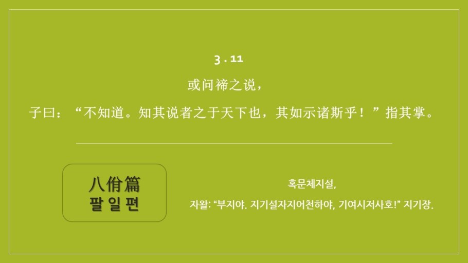或問禘之說, 子曰: "不知也. 知其說者之於天下也, 其如示諸斯乎!" 指其掌.