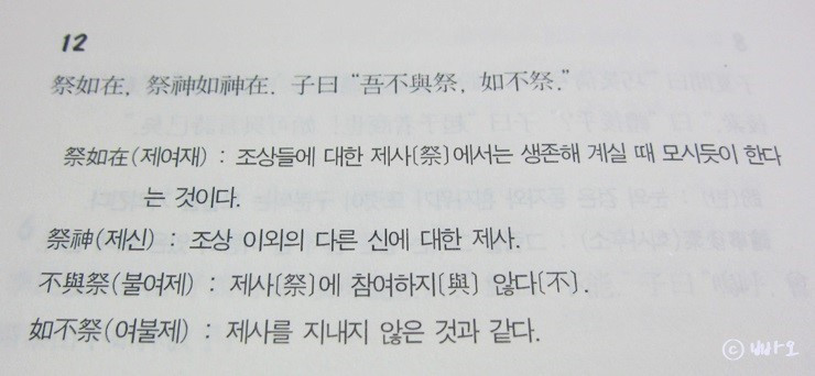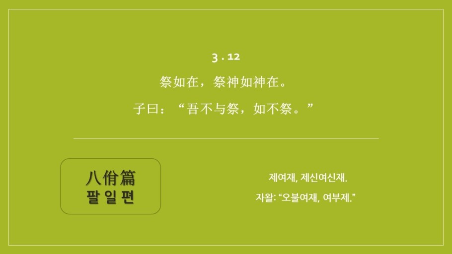 제사를 지낼 때는, (마치 조상이) 계시는 것처럼 하셨으며, 신을 제사 지낼 때는 신이 계신 듯이 하셨다. 공자께서 말씀하셨다. "내가 제사에 참여하지 않으면 마치 제사하지 않은 것과 같다."
