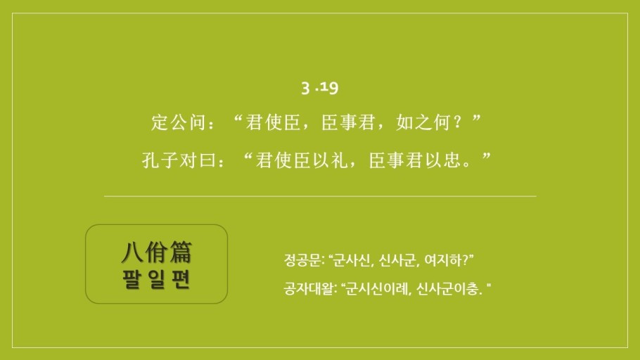 정공이 "임금이 신하를 부리는 것과 신하가 임금을 섬기는 것은 어떻게 해야 합니까?" 묻자, 공자께서 대답하셨다. "임금은 신하를 부리기를 예로써 하고, 신하는 임금을 섬기기를 충성으로써 해야 합니다."