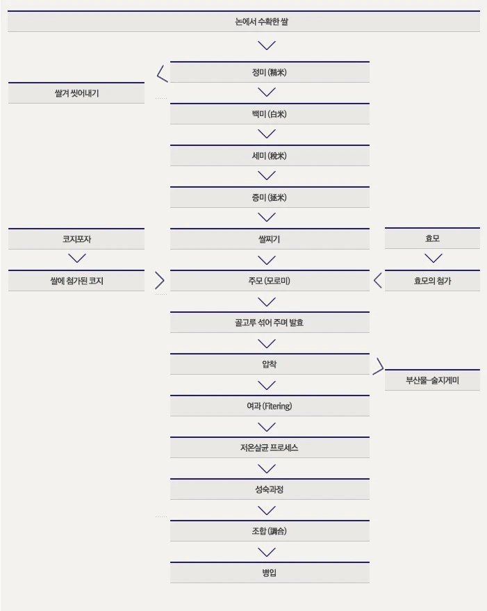 기본적으로 사케는 쌀과 누룩, 효모, 그리고 물, 이 네 가지만으로 빚어낸다. 가끔 사케의 종류에 따라 양조 알코올 등의 부가 재료나 몇 가지 조미료가 첨가되는 경우도 있긴 하지만, 말 그대로 ‘첨가’라는 것은 선택의 기준일 뿐, 필수적인 요소가 아니다. 이 네 가지 기본 재료는 필수이고 기존이며 사케를 이루는 바탕이다.
