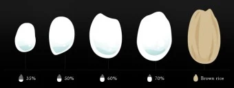얼마나 깎아내고 남았는가를 수치화한 정미율을 ‘정미보합(精米歩合;세이마이부아이)‘라고 하는데, 보통 ‘精米歩合 70%’라고 표기되어 있으면 현미를 기준으로 겉면의 30%를 깎아내고 남은 부분이 70%라는 의미이다. 앞서 설명에서 쌀의 중심부는 영양분이 거의 없다고 했는데, 전분이 많이 함유되어 있다.