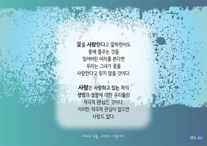 사람들이 느끼는 사랑이란, 아마도 그런 느낌일 것입니다. 그것을 느낄 수 있는 기회가 이 책이 된다면 그것이 이미 말한 바 있는 사랑의 기술이라고 이름 불릴 것입니다. 아무리 요즘 사람들이 사랑이라는 것을 껍데기로만 알고 감각적인 것만으로 탐닉한다 할지라도 세상이 아직 살아갈만하다고 느끼는 당신이 있다면 그건 진정한 사랑이 무엇인가를 아는 이들이 많은 덕분일 겁니다.