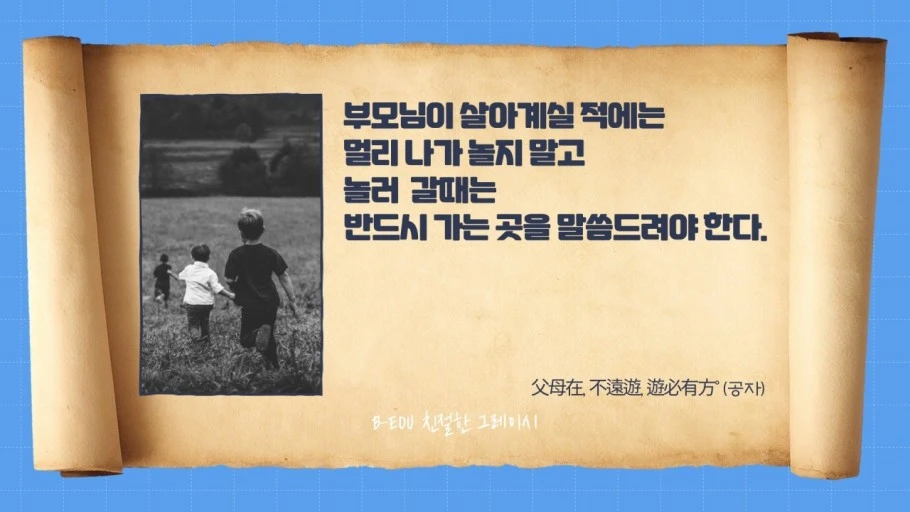 이 장의 내용은 표지 사진에 나와 있는 <四字小學(사자소학)>에서부터 <명심보감>의 ‘효행편’과 <小學(소학)> ‘明倫(명륜) 8章’에도 같은 글이 실려있다. 기본적으로 글을 배우기 시작하는 어린 나이에서부터 반드시 지켜야 할 항목이라고 하여 강조되어 가르쳐왔었기 때문이다. 자식으로서 해야 할 효도의 가장 기본적인 항목으로 왜 부모님이 살아계실 때, 멀리 나가지 말고, 나가더라도 행방을 알리라고 했을까?