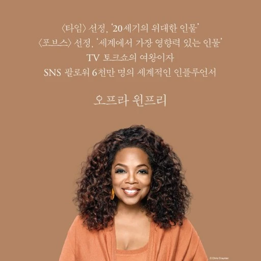 미국의 방송인이자 배우로, 미국 쇼 비즈니스 세계에서 가장 영향력 있고 존경받는 인물 중 한 명. 그야말로 가난과 절망을 딛고 전 세계 흑인 여성들 중, 아니 여성 중에서 가장 성공한 인물로 2021년 3월 포브스 기준 재산이 무려 27억 달러 (한화 약 3조 460억 원)에 달하는 오프라 게일 윈프리(Oprah Gail Winfrey)의 이야기이다.