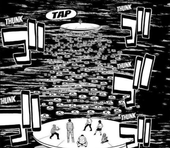 <오징어 게임>에서 등장하는 첫 번째 게임은, 이미 다양한 리뷰에서 적잖이 언급되었던 <신이 말하는 대로>라는 일본 만화에서, 첫 번째 살아남기 위한 게임으로 나오는 것과 동일하다.