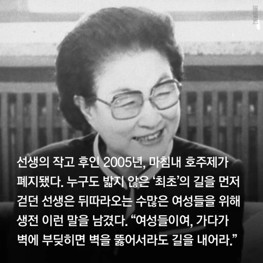 그녀의 끊임없는 노력으로 우리나라의 가정법원이라는 것이 세워졌고, 이후에도 가족법 개정운동을 추진하여 이혼녀의 재산분할 청구권 인정과, 기존의 친척 관계를 모계·부계 혈족을 모두 8촌 이내로 축소할 것을 그녀는 당당히 요구했다.