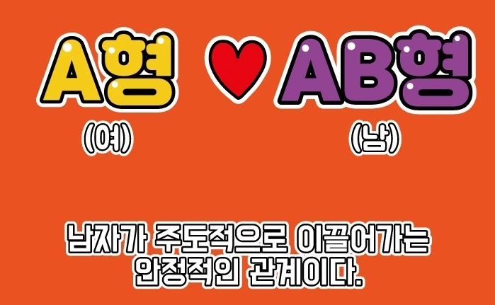 A형 여자와 AB형 남자는 양쪽 모두 침착한 성향을 갖추고 있는 편이어서 서로의 장점을 충분히 인정하며 안정된 관계를 유지할 수 있다. 웬만한 돌발변수 정도에는 쉽게 흔들리지 않기 때문에 두 사람이 관계를 유지하는 양태를 살펴보면, 마치 우리 진지에 훌륭한 참모가 두 사람이나 있어 서로 눈만 보고서도 어떤 의도인지를 바로바로 이해하는 묘한 텔레파시를 주고받는 듯한 느낌을 받을 경우가 많다.