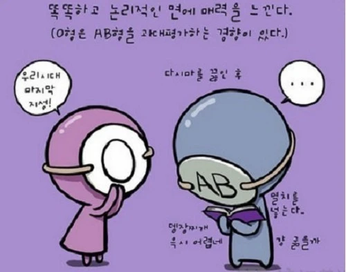 직설적으로 자신의 감정표현을 하는 것에 익숙한 O형 여자들은, 매사에 분명치 않고 애매모호한 표현에 익숙한 능구렁이 타입의 AB형 남자가 보이는 태도 때문에 속을 태우는 경우가 많다.