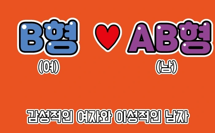 한마디로 이들의 연애관계를 규정하자면, AB형의 남자는 ‘COOL’, B형 여자는 ‘HOT’이라고 구분하여 설명할 수 있을 것 같다. 여러 가지 변수에 따라 경우의 수가 세분화될 가능성은 있겠지만, 시작은 저마다 다르더라도, 연인이 되거나 결혼을 하게 되면, 대부분의 이 커플의 유형은., 여자 쪽이 더 애가 타서 남자를 따라다니고 매달리는 관계가 될 가능성이 농후한 편이니 참고할 것.