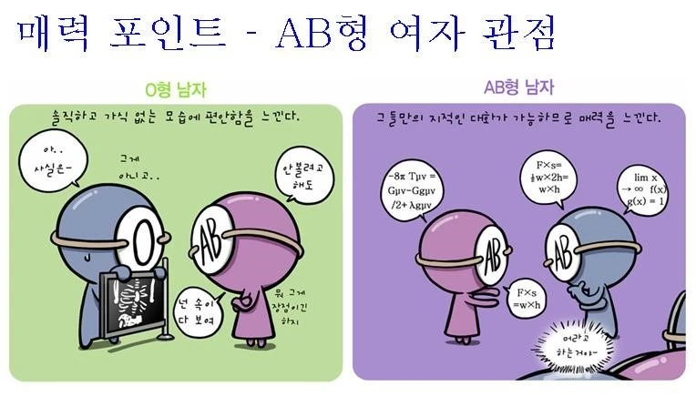 여자는, 남자의 군더더기 없는 이야기나 다소 독특한(?) 유머감각에 대해 일종의 동경심(?)마저 갖고 있기 때문에 AB형 남자가 “이렇게 하자”라고 리드하면 크게 이견을 달지 않고 순순히 따라나서는 편이다.